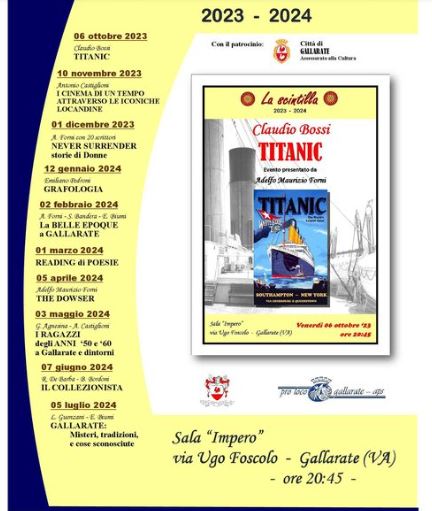 Scocca la prima SCINTILLA: per la prima volta nella nostra città, la conferenza di Claudio BOSSI. Evento multimediale corredato da immagini e filmati dell’epoca, alcuni inediti: si parlerà della Belle Epoque, del transatlantico, di quella crociera tragicamente interrotta, degli enigmi, e di due personaggi del varesotto che si trovavano a bordo (uno di questi ripreso poi da Cameron nel film del 1997).