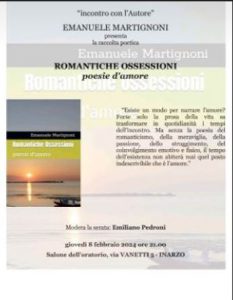 Giovedì 8 febbraio alle ore 21 presso il salone dell’oratorio di via Vanetti, 5 a Inarzo l’autore Emanuele Martignoni presenterà il suo nuovo romanzo ” Romantiche ossessioni”, modera la serata: Emiliano Pedroni.
