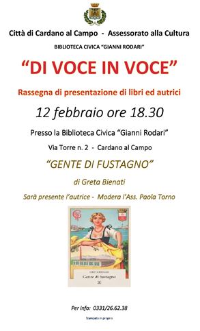 Giovedì 12 febbraio alle ore 18,30 presso la Biblioteca Civica “Gianni Rodari”, via Torre 2, Cardano al Campo, Greta Bienati presenterà il suo ultimo romanzo “Gente di fustagno”, insieme a Giuliano Tosi e all’assessore Paola Torno.